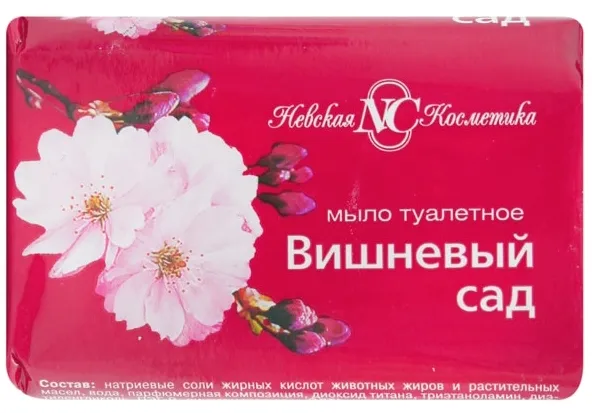 Мыло туалетное «Вишневый сад». Мыло с ароматами благоухающих садов. Бережно и эффективно очищает кожу, при намыливании образует пышную пену. Подходит для любого типа кожи.