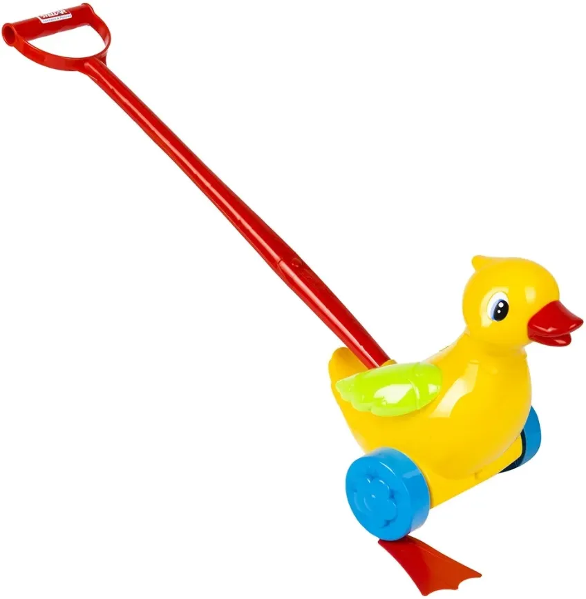 Каталка "Уточка" во время движения крякает, хлопает крылышками и забавно шлепает ластами, переваливаясь как настоящая.