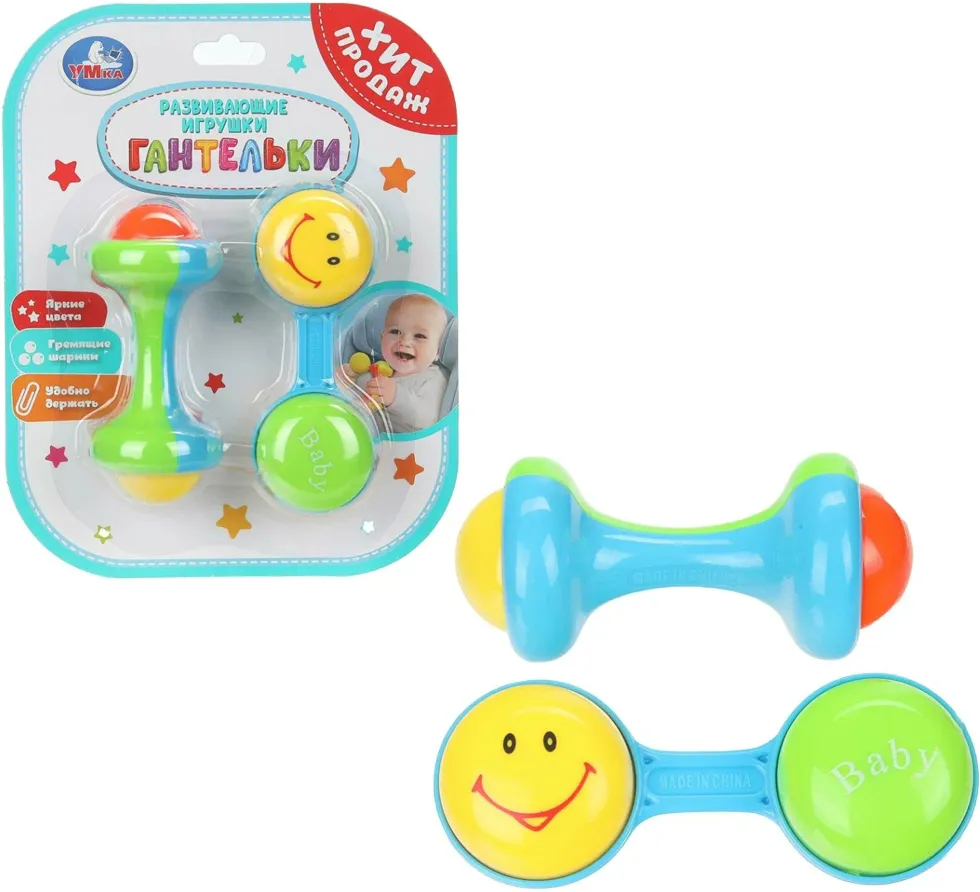 Яркий внешний вид и весело гремящие разноцветные шарики непременно привлекут внимание ребёнка. Удобная форма позволит малышу самому брать погремушку в руки.