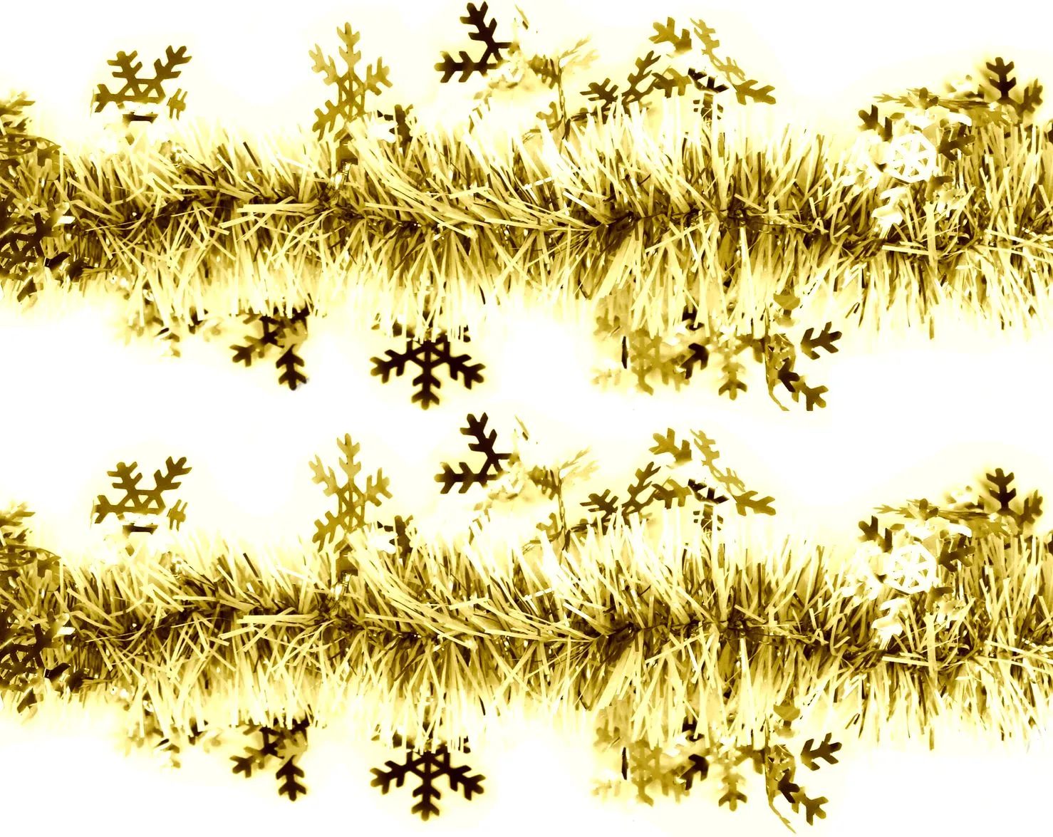 Мишура с металлическим блеском, имеет комбинированный цвет благодаря белым вкраплениям, обрамлена снежинками.