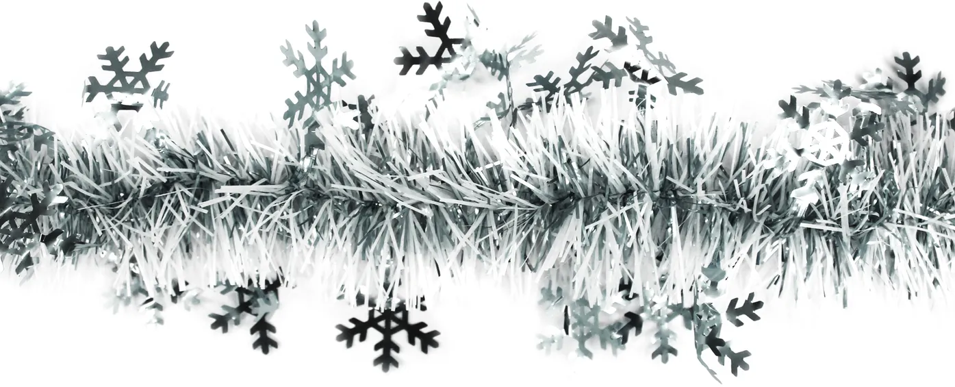 Мишура с металлическим блеском, имеет комбинированный цвет благодаря белым вкраплениям, обрамлена снежинками.