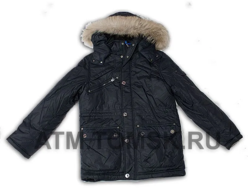 На молнии, скрытой планкой на клепках Капюшон оторочен натуральным мехом